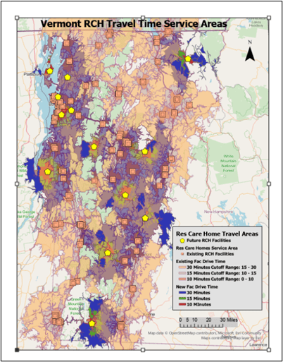 This study reviews the existing Vermont Long-Term Health Care Facilities and forecasts their demand for the year 2030 by Location, Facility Type and Service Type. The Facility Types are Residential Care Homes (RCH), Assisted Living Residences (ALR) and Nursing Homes (NH). Service Type Beds are herein defined as Memory Care-Special Care (MC-SC) and Other Care.